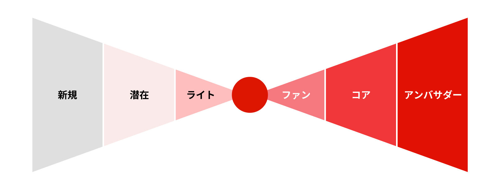 新規→潜在→ライト→ファン→コア→アンバサダーの6段階でファンの成長ステップを定義。