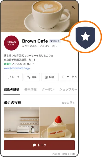 ユーザーは、このバッジを見ることで、なりすましや非公式のアカウントではないと一目で判断できるため、安心して友だち追加や情報の受信ができます。