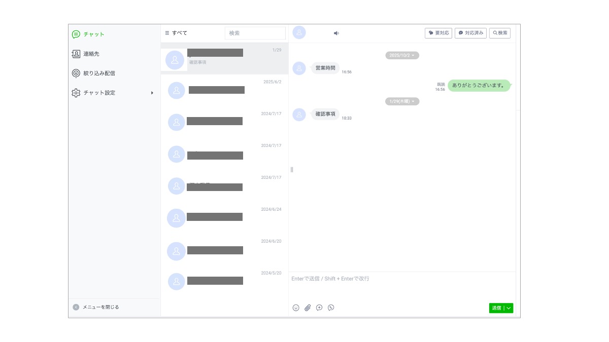 つまり、友だち追加後に一度もやり取りがないユーザーは、運営者側のチャットリストには現れない仕組みです。