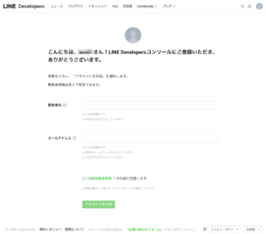 アカウント作成画面が表示されたら、開発者名とメールアドレスを入力し、規約を確認後、作成ボタンを押します。