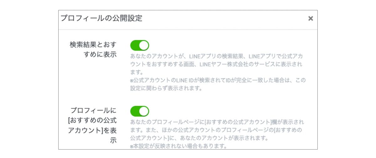 LINE Official Account Managerには、アカウントを検索結果に表示させるかどうかを選択する項目が存在します。
