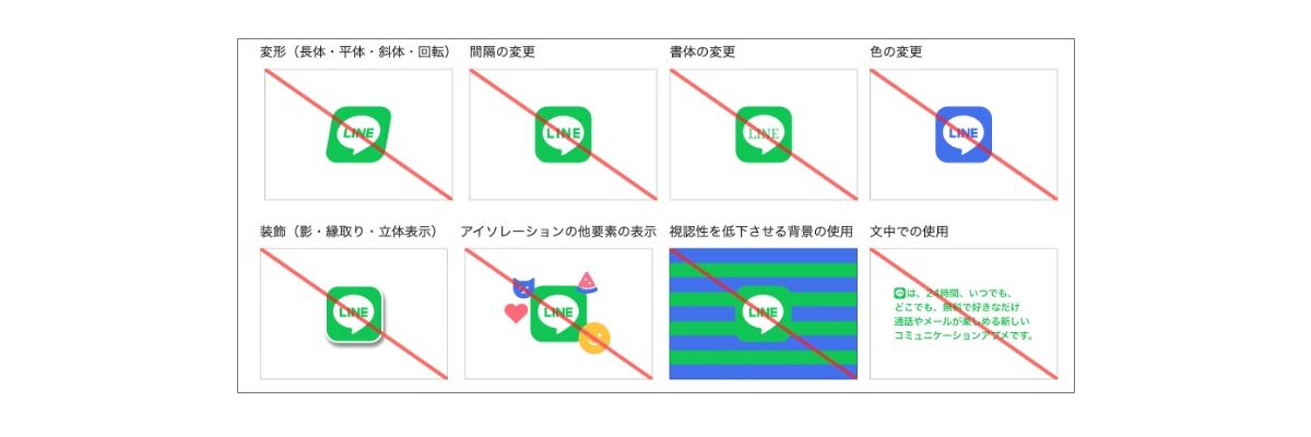 例えば、「詳細はLINEでご連絡ください」という文章の「LINE」の部分をロゴに置き換えるといった使い方は認められていません。